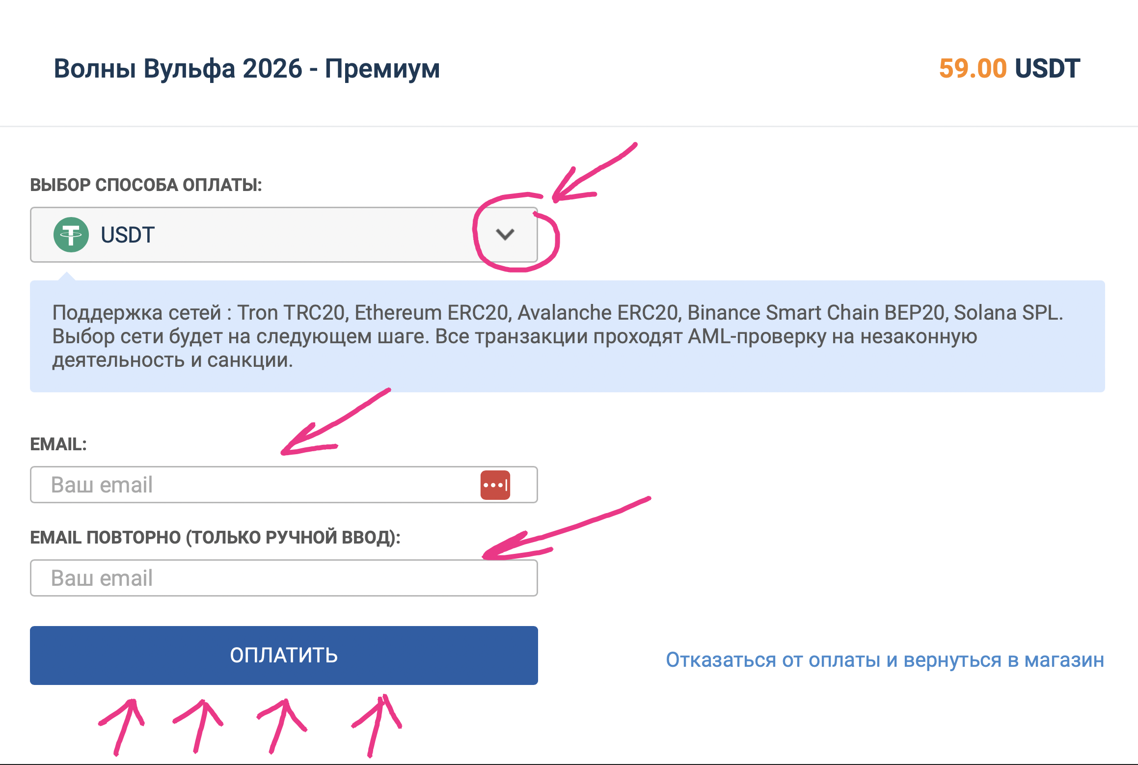Переходите по ЭТОЙ ССЫЛКЕ >>: выбираете подходящий способ, валюту, криптовалюту, обязательно укажите e-mail, и жмите ОПЛАТИТЬ